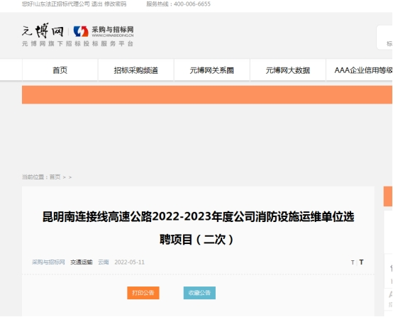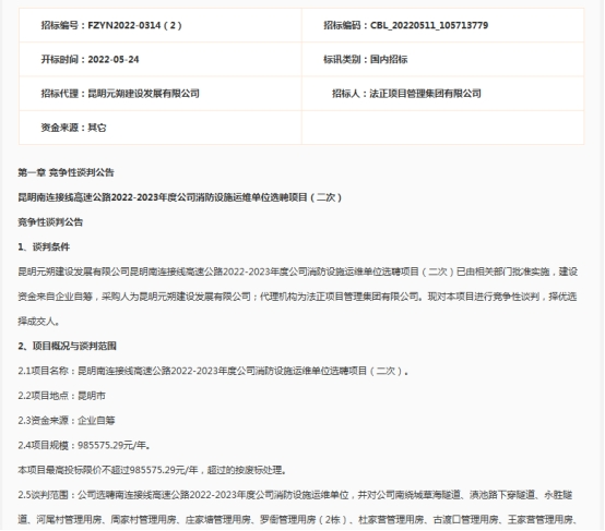昆明南连接线高速公路2022-2023年度公司消防设施运维单位选聘项目(二次)竞争性谈判公告