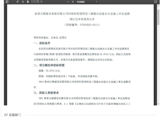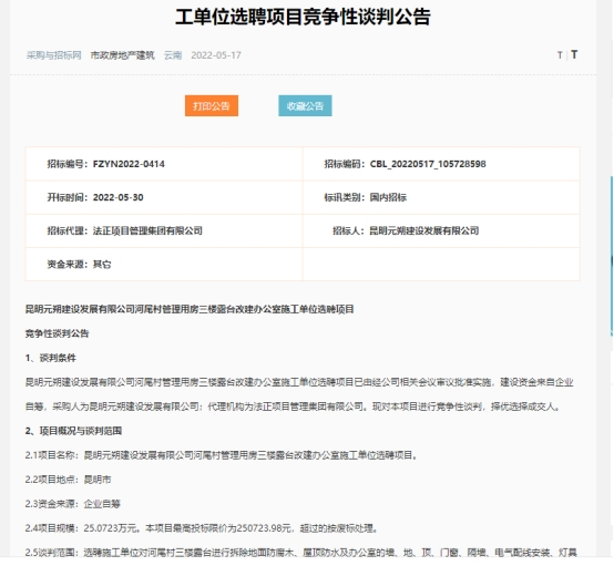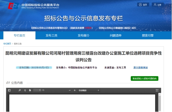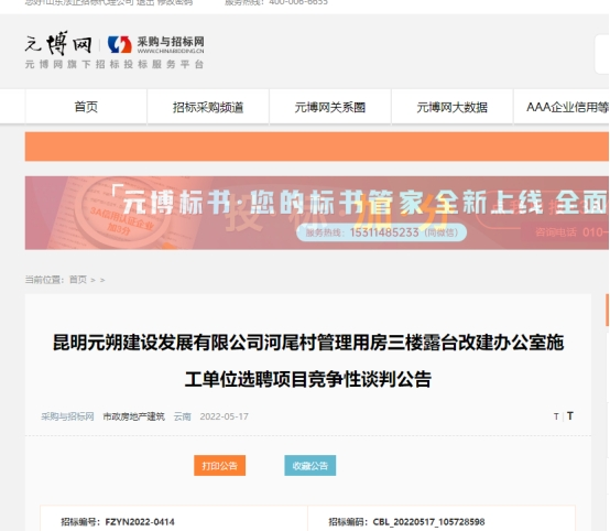 昆明元朔建设发展有限公司河尾村管理用房三楼露台改建办公室施工单位选聘项目竞争性谈判公告