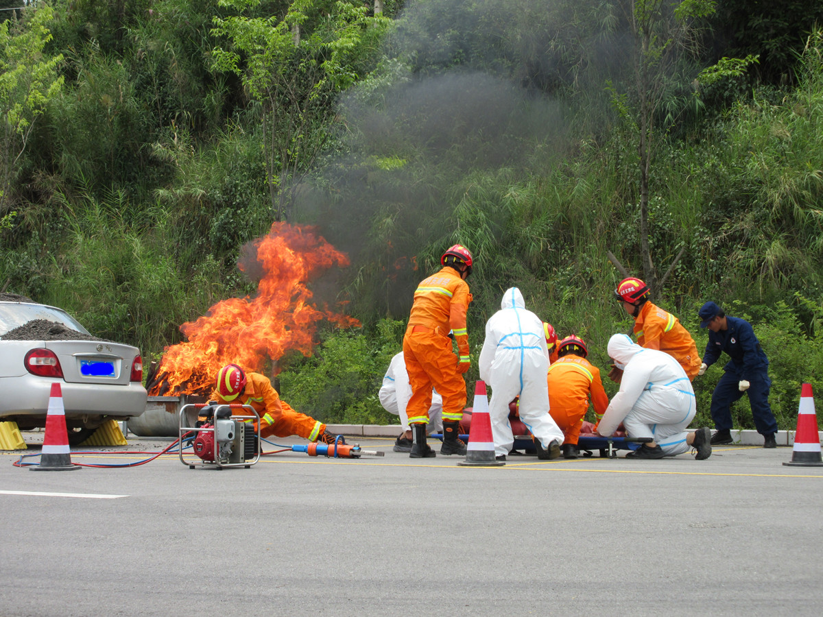 本次演练以模拟东南绕高速公路突发地质灾害引发车辆火灾,造成人员受伤并阻断交通为背景,在接到“险情”报告后,立即启动应急预案,请求交警实施临时交通管制,各应急小组成员在演练指挥领导小组的有序指挥下,有条不紊的开展应急处置工作,东南绕高速公路专职消防救援队对现场受伤人员进行营救并送医,通知路政、交警对现场进行事故勘查;在查明险情情况后,现场处置组织装载机、运输车、清扫人员进场对塌方体进行清理,经过一个多小时的奋战,塌方体清理完成,恢复交通,演练圆满成功。
