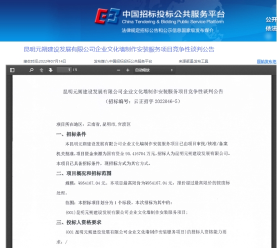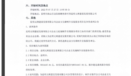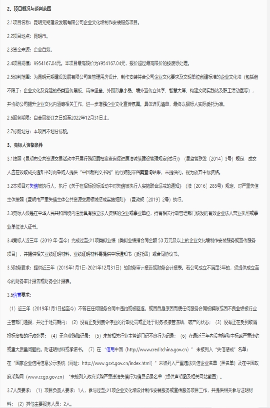 昆明元朔建设发展有限公司企业文化墙制作安装服务项目竞争性谈判公告