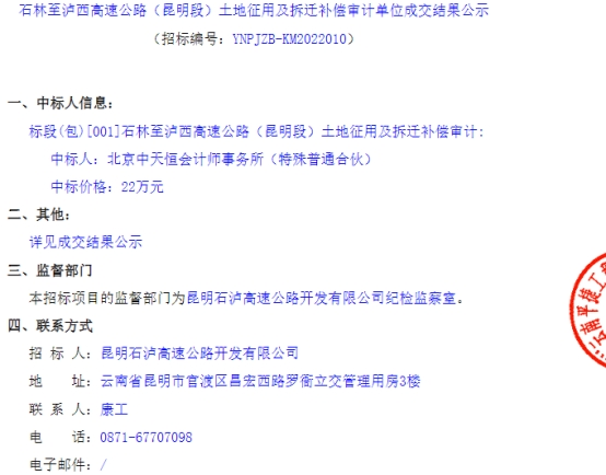石林至泸西高速公路(昆明段)土地征用及拆迁补偿审计中标结果公示