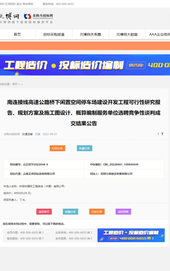 南连接线高速公路桥下闲置空间停车场建设开发工程可行性研究报告、规划方案及施工图设计、概算编制服务单位选聘成交结果公告