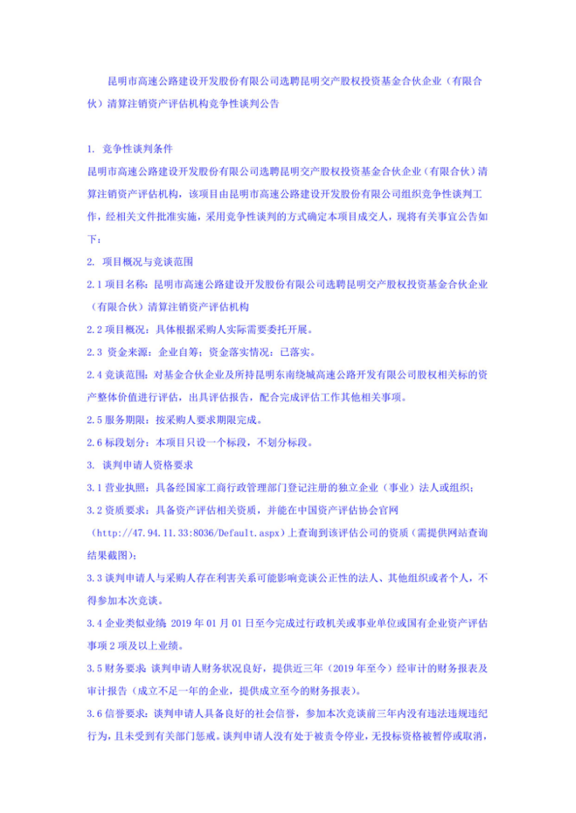 昆明市高速公路建设开发股份有限公司选聘昆明交产股权投资基金合伙企业(有限合伙)清算注销资产评估机构竞争性谈判公告