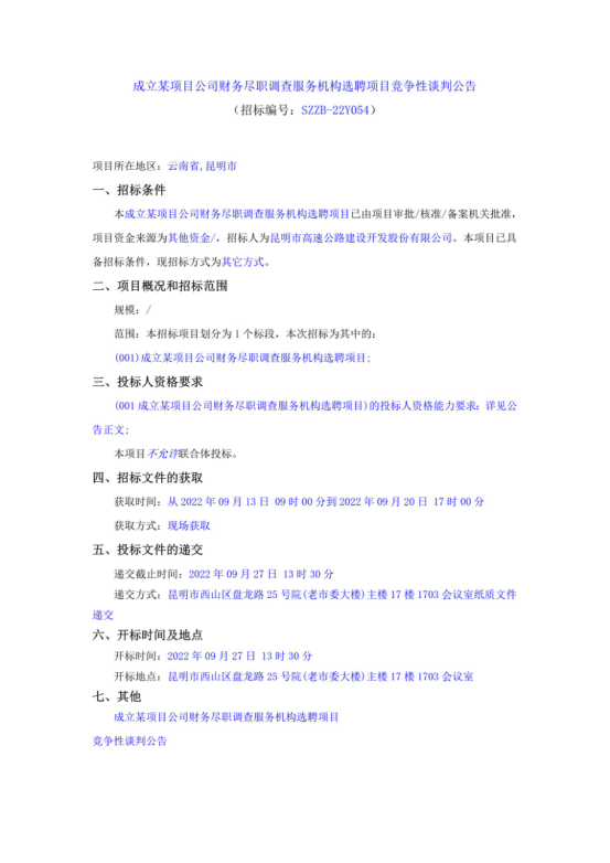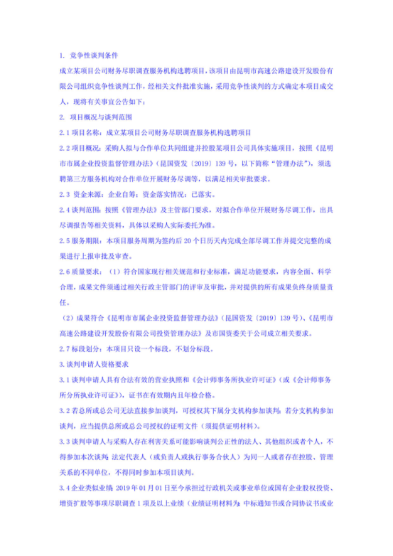成立某项目公司财务尽职调查服务机构选聘项目竞争性谈判公告