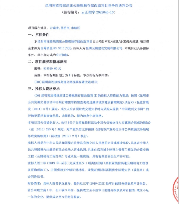 昆明南连接线高速公路视频存储改造项目竞争性谈判公告